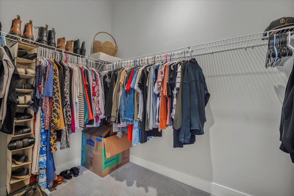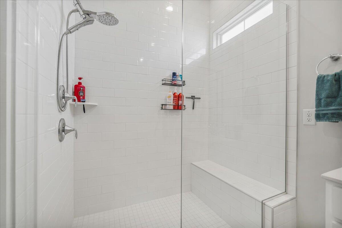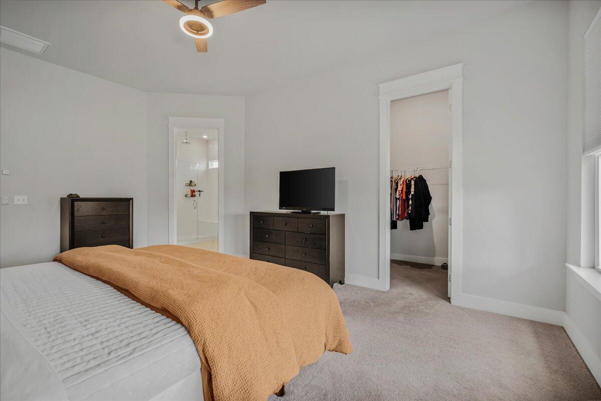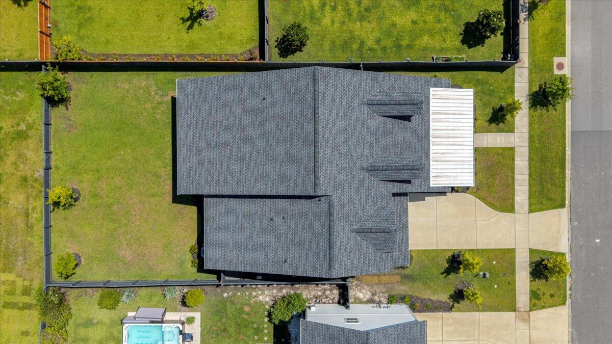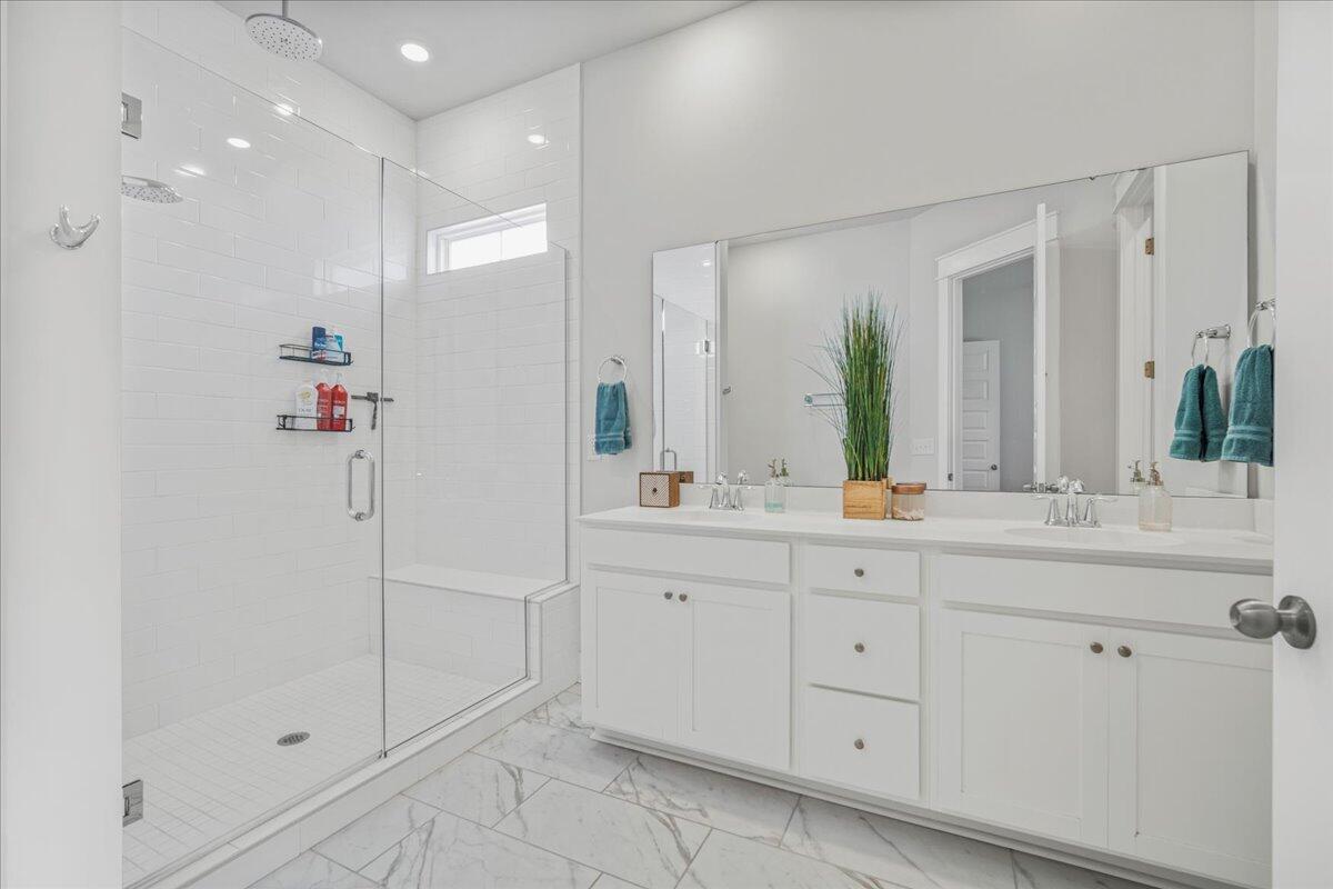 The primary bedroom located on the main level also offers plenty of space, a walk-in closet and a spa like bath featuring dual vanities, a large walk-in shower with rain-head faucet and a convenient bench. This bedroom also highlights a nice view to the expansive back yard with a privacy fence, shady covered patio and plenty of room for outside fun.